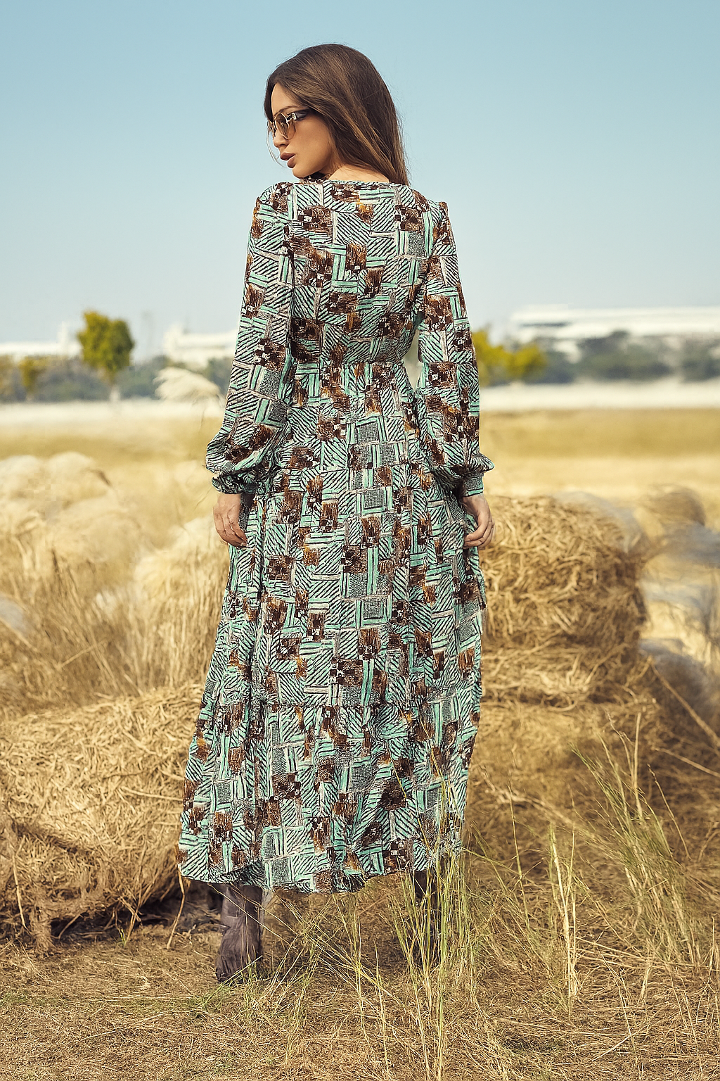 Son imprimé bohème chic aux accents vintage et sa coupe longue fluide créent une silhouette élégante et affirmée.